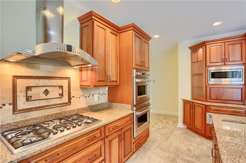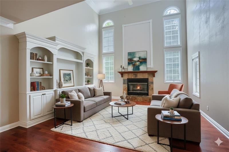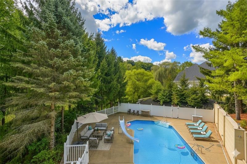 From the moment you arrive, this home impresses with professional landscaping, multiple balconies, and striking double doors. Inside, a two-story foyer boasts soaring ceilings, crown molding, tile floors, and a dramatic picture window. French doors open to a den with judges paneling, built-ins, wet bar, and a cozy sitting room with fireplace. The formal living room features hardwood floors and balcony access, while the expansive family room wows with 18-ft ceilings, arched windows, columns, fireplace, and custom built-ins. The gourmet kitchen offers soft-close cabinetry, granite counters, island, double ovens, 5-burner range, warming drawer, and eat-in area opening to a balcony. Upstairs, the primary suite has a sitting room, tray ceiling, custom closet, balcony, and spa bath. Additional bedrooms are spacious with walk-ins. The lower level offers a full kitchen, game room, gym with sauna, family room, and sliders to a backyard oasis with inground pool, landscaping, and peaceful creek.